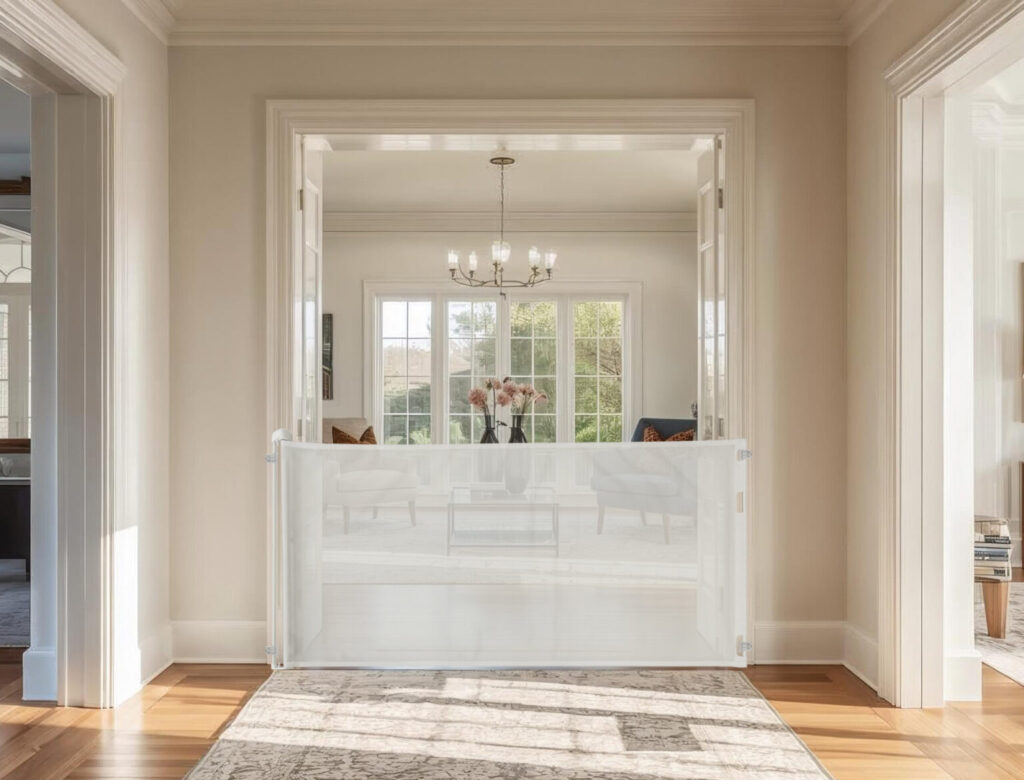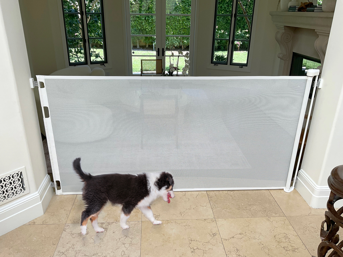 The 96 XT Pet Gate from Smart Retract is engineered specifically to address these challenges. Standing 44 inches tall at the mesh with the reel reaching 46.5 inches from the floor, this extra-tall pet gate provides the height necessary to deter even the most determined pets. Combined with an impressive width extending up to 96 inches, the 96 XT Pet Gate delivers exceptional containment for larger pets and wider openings that other pet gates simply cannot accommodate
