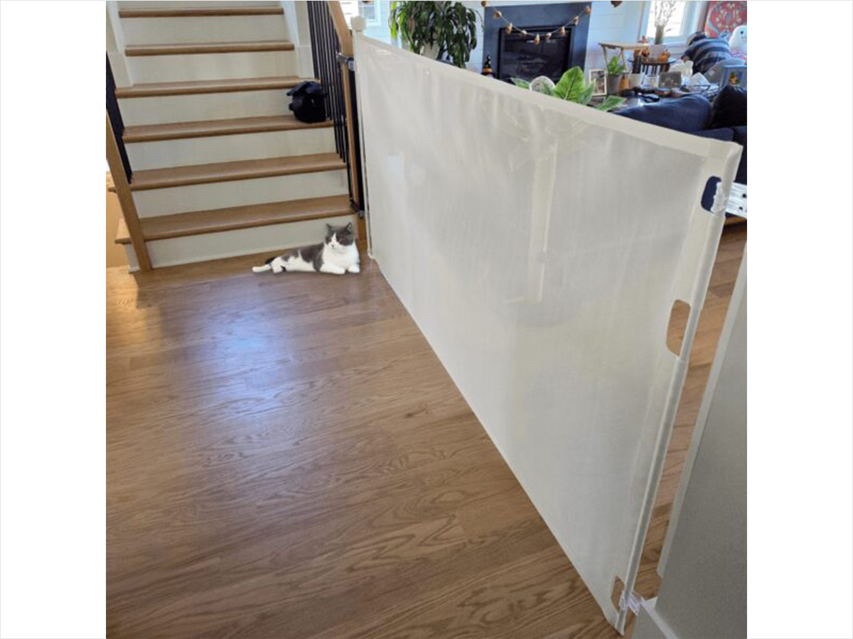 For pet containment at stairway entries, use a retractable pet gate that mounts securely with hardware and extends up to 96 inches wide for larger openings. These gates provide effective barriers for dogs and cats while retracting to just 3 inches in diameter when not needed.